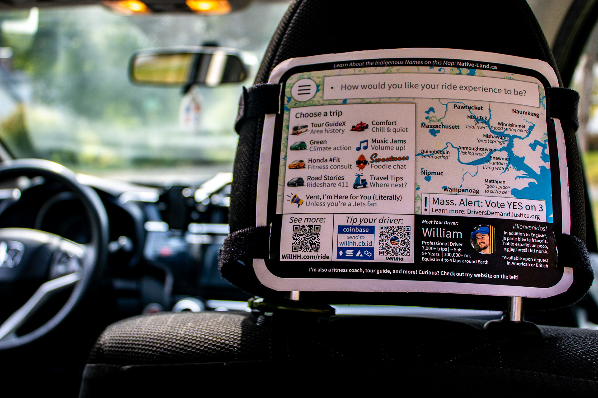 Many educators were drawn to the Indigenous place names and left the ride better equipped to engage with their students and others. Tourists and people who recently moved engaged with the tour option the most. Since this overlapped with the build-up to the November 5th election, and the Massachusetts Question 3 was on the subject of rideshare drivers' rights, many people were looking for voices they could trust on the subject. Tipping did increase significantly as a relatively larger portion of income, however gross totals for tipping was only marginally higher.